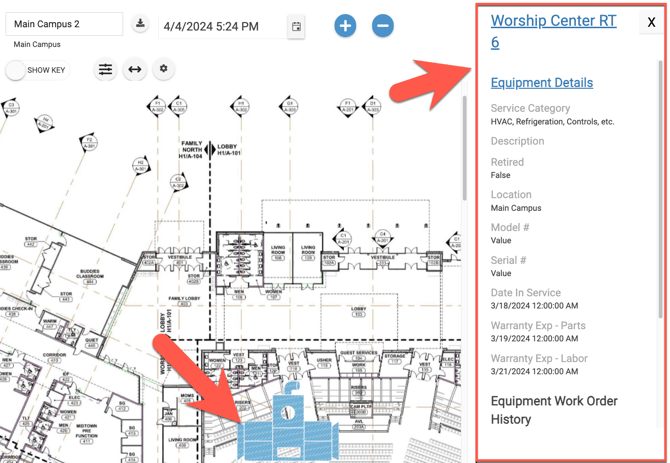 Once the equipment is linked to the floor plan, depending on what service categories you have selected to show, you will then be able to click on an equipment icon to see the work order history for those equipment pieces.