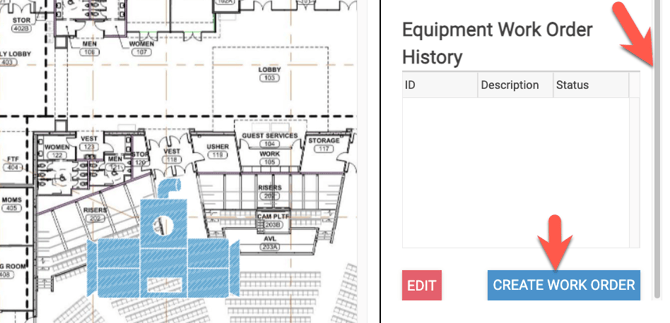 After Clicking on a piece of equipment on the Floor Plan, if you use the vertical scroll bar to navigate to the bottom of the equipment window you will see the option to "Create Work Order" for that piece of equipment. After selecting that option you will be navigated to the work order creation page in Work Order & Asset Management.