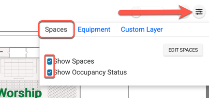 In order to enable or disable space names and/or event details from showing on the floor plan you can either check or uncheck them to display. Click the menu option at the top right, choose the Spaces tab, and then either check or uncheck "Show Spaces" and/or "Show Occupancy Status".