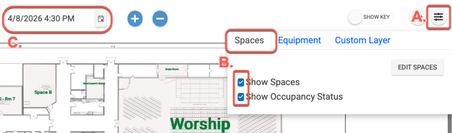 Once spaces are linked to their spot on the floor plan (performed by an admin or a user or sub-admin who has editing access) and you have enabled "Show Spaces" and "Show Occupancy Status" under the menu option, then you can adjust the date and time at top left to see events for a specific date and time. This allows you to visually see what spaces are booked for events as well as when spaces are available for additional events.