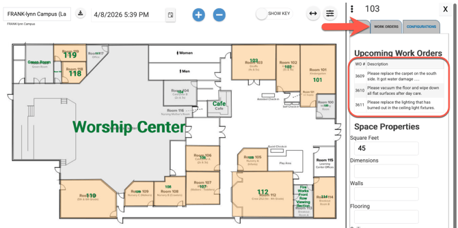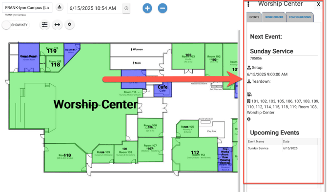 For any spaces that are linked to your floor plan, once you click on the space, a side menu will appear to the right of the page. This side menu will include an Event Tab, which will show event information (from Event Scheduler) and a Work Order tab which will show work orders (from Work Order & Asset Management).