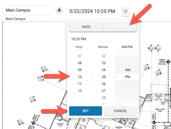 - Click "Time" and either hover over the Hour/Minute/AM/PM and use your mouse wheel to scroll up or down to select a time OR click on the Hour, Minute, and AM/PM opinion that you want. Once you have made your selection, click "Set".