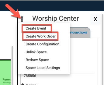 - In order to create an event request or a work order request, click the three dots to the left of the space name and choose Create Event or Create Work Order.