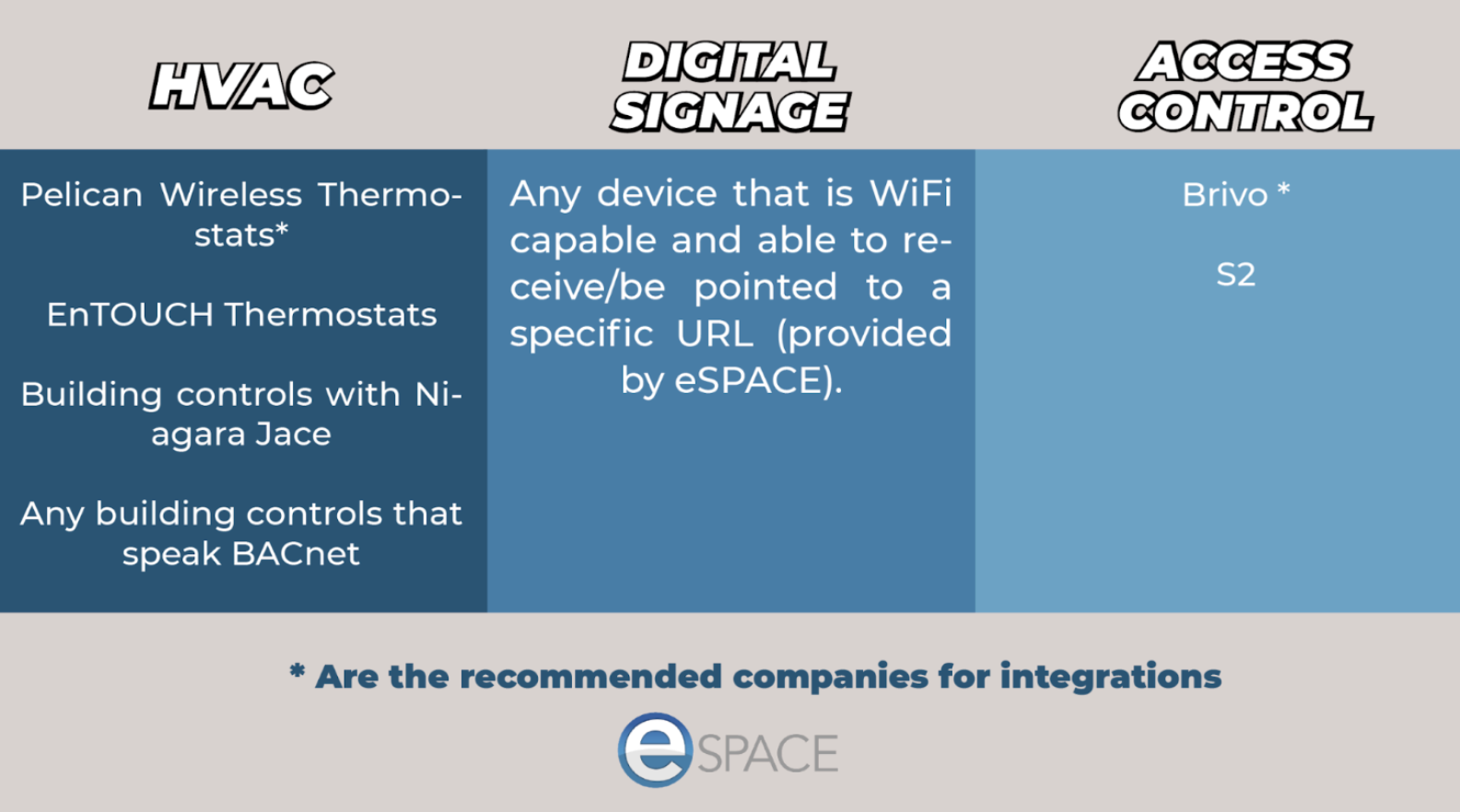 FACILITeSPACE is our module that allows us to integrate with different HVAC controls, security door companies, and digital signage displays.