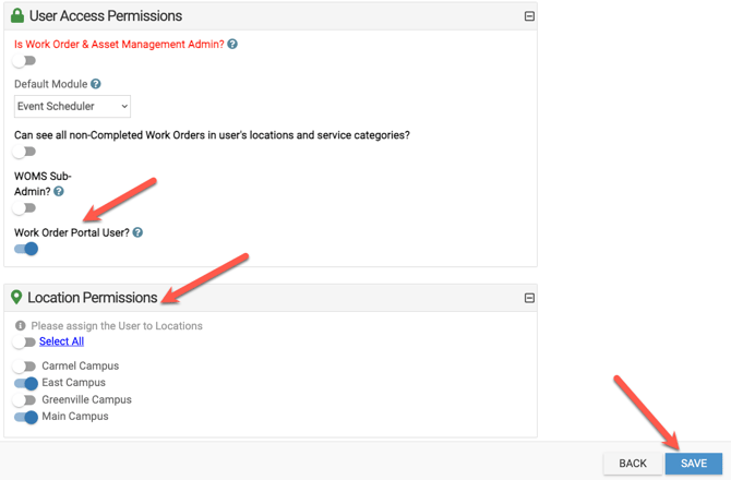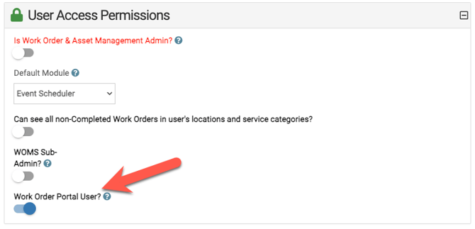 Next, go to User Access Permissions and toggle on "Work Order Portal User".