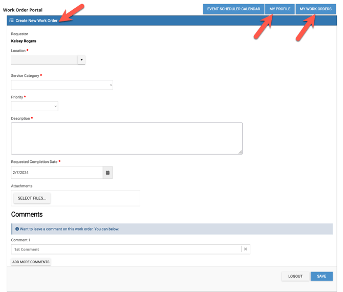 When a portal user logs into Work Order & Asset Management they will have a limited view where they can only request work orders, see the work orders they have submitted and their profile information.