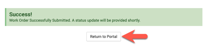 Depending on how an admin After a portal user submits a work order, they will see a Success message and an option to return to their portal.