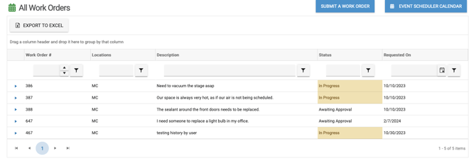 A portal user can click on "My Work Orders" at the top right hand side of their account in order to navigate to a page where they can see the status of any work order they submitted.