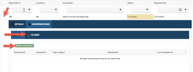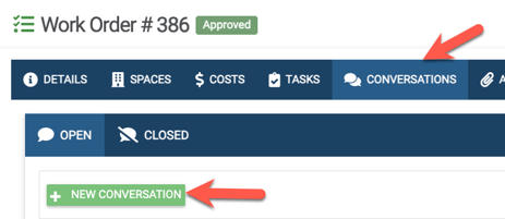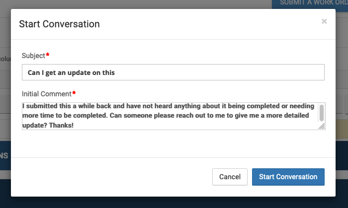 Portal Users can expand any of their work orders, go to the Conversations tab and start a conversation/add a comment for admins, sub-admin, and regular users to see (depending on their permission settings and the service category, department, location and user-assigned on the work order).