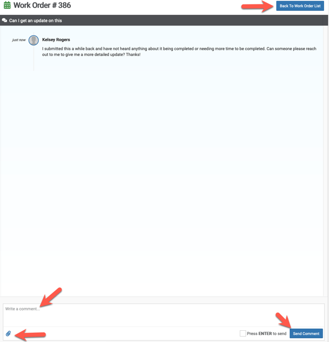 Here they can submit another comment, add an attachment, or go back to their portal home page/work order list.