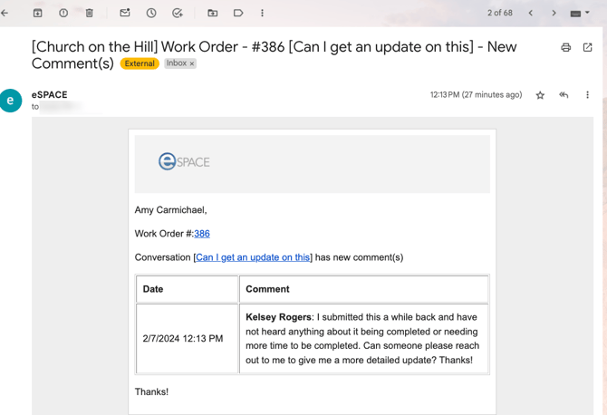 Once an eSPACE user starts a conversation with the portal user, the two can continue to conversate on that conversation thread until the work order is complete and closed.