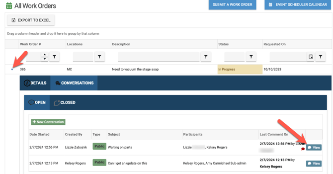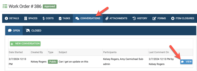 They can click on the work order number to then be automatically navigated to the conversation's tab on that particular work order. Once there, they can click "View" to see their comment.