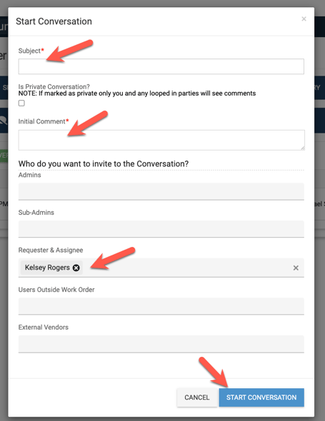 After they click "New Conversation" a pop-up box will appear for them to enter the title of their conversation and an initial comment.