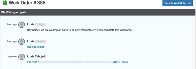 If the admin, sub-admins, or regular user has added a file to the conversation, the portal user will see them in the conversation when they click to "View" the conversation inside their work order on their work order portal.