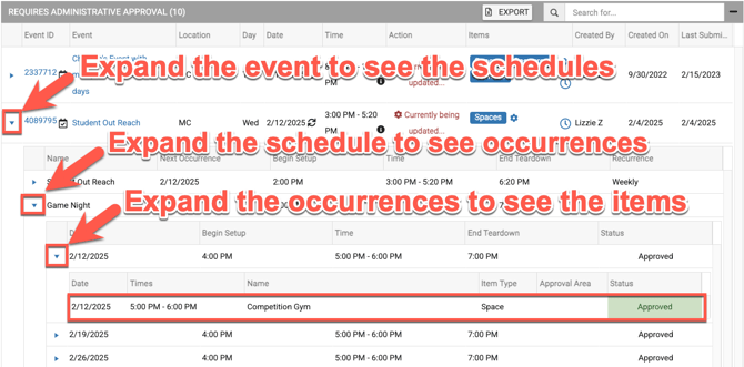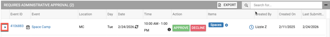 Admins can also expand the event by clicking on the "blue arrow" to see event details.