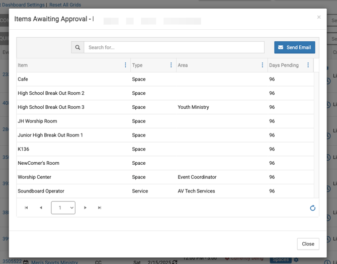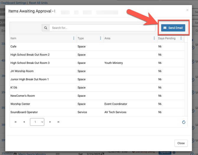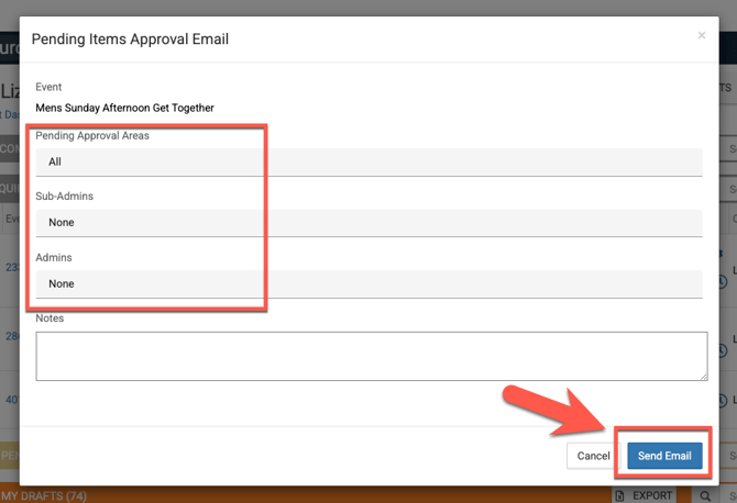 When an admin sees that sub-admins have not yet approved their items on events, they can choose to send an email to any Sub-Admins or Admins that have pending items.
