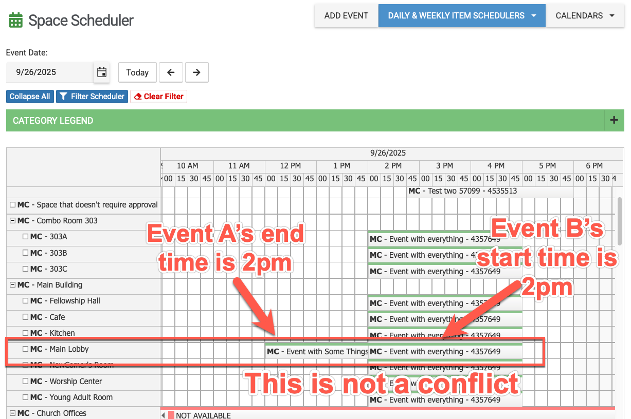 - Events are able to "overlap" by a minute, and it is not considered a conflict. If event A has either an end tear down time or an end time of time X (Ex: 2pm) and event B has either a setup time or an event start time of X (Ex: 2pm), then they are not considered to be in conflict with each other.