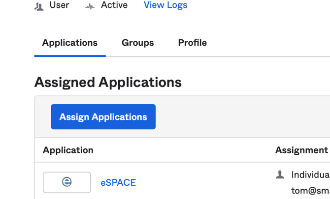 Most IdPs allow users to be managed - specifically to be granted or denied access to connected applications. Once your organization's eSPACE and IdP accounts are connected, you may need to assign your IdP users to be able to access eSPACE (in your IdP's admin console). If you've used an IdP before, this should be familiar to you. Here is a screenshot of how this looks in an IdP called Okta.
