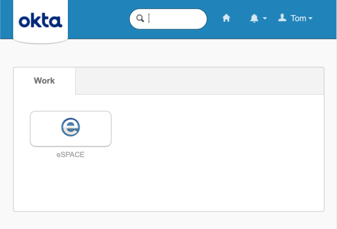 There are two ways assigned users will be able to access eSPACE through your IdP. The first is from the IdP itself. As an assigned user, the eSPACE application will appear on the IdP site and they simply need to click it to be automatically logged in. This screenshot shows what this looks like in Okta.