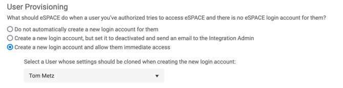 When you assign a user (in your IdP) to the eSPACE application, it is their email address serves as the identifying information between both systems. If the user has an eSPACE account already, and their email address in both systems are the same, they will be able to log in to their existing eSPACE. However, if they do not have an eSPACE account, a new eSPACE user account may be provisioned depending on this setting on the eSPACE SSO Setup page: