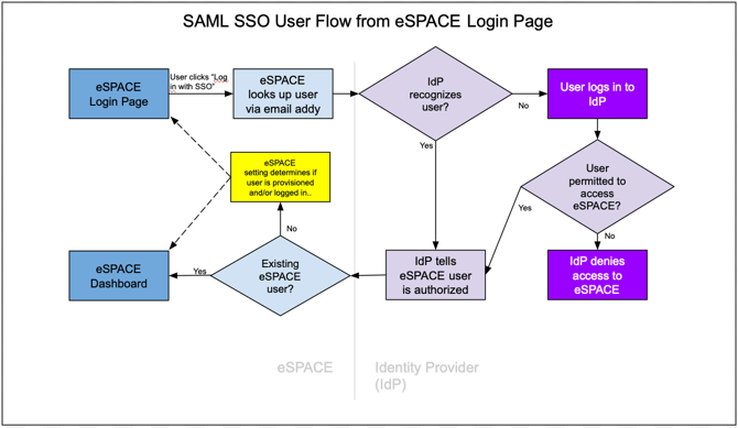 If you have configured your SSO settings in eSPACE to only allow users to log in via SSO (and not permit login via the regular eSPACE login page), this will essentially allow you to use your IdP to regulate who can get into eSPACE. Thus, if someone needs to be removed or suspended in your IdP and the user should no longer have access to eSPACE, the administrator should either log in to eSPACE and delete/deactivate their account there, or ensure their SSO settings in eSPACE are configured to require all logins to go through SSO.