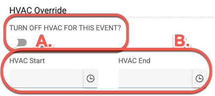 If you are using the Event Scheduler module and are an Admin, you have the ability to override the HVAC system. You have the ability to turn off the HVAC for the event, or simply override the HVAC start and/or end times as shown below.