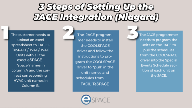 - Once your account has the JACE integration, 1. you have imported an Excel spreadsheet of the assigned HVAC units and spaces to the HVAC integration in FACILITeSPACE, then you will be ready for your controls programmer to follow the COOLSPACE Driver integration guide. 2. They will need to install the driver on the JACE (or supervisory controller) and then by following the integration guide, they will program it to reach out to your eSPACE account and sync in the schedules for the next 24 hours (only approved events are made available for the driver to sync over). 3. After your controls programmer has set it up, the units on the JACE will then “pull” the events from the driver to their Special Events Schedule tab so the HVAC units on the JACE know when to engage or disengage the HVAC.