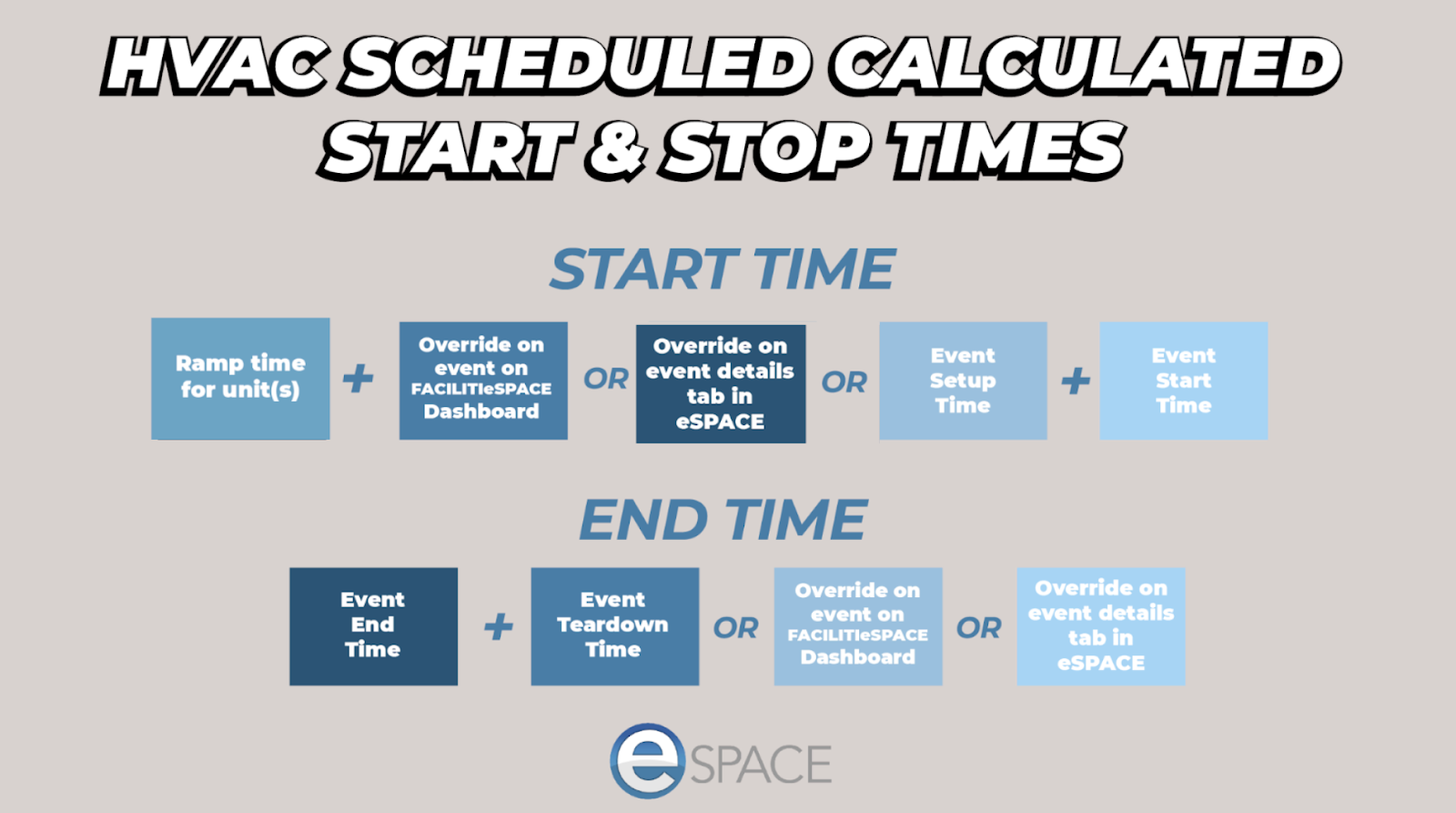 - If the events have setup and tear-down times, eSPACE will use that as the start and end time for the HVAC.