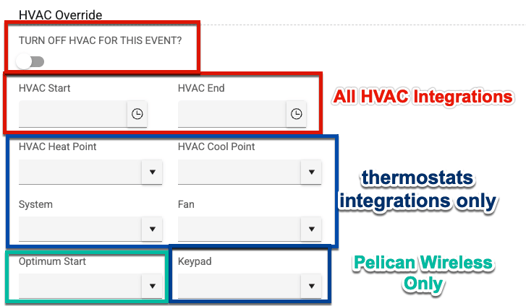 - For example, if you have an approved event with a Setup time at 6:30 AM but the actual event Start time is not until 3 PM, you may not want the HVAC engaging at 6:30 AM. So, you can choose an override time that would start the HVAC at Noon to start cooling the space prior to the event start time.