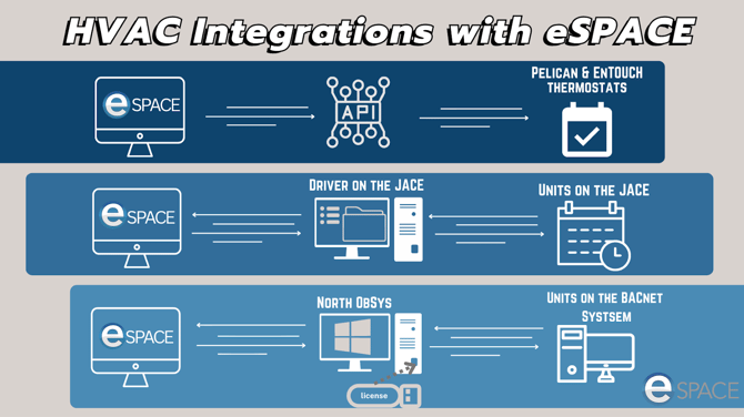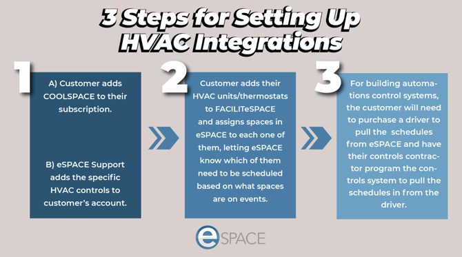 - There are several steps for setting up each HVAC integration and they vary depending on what HVAC controls you are integrating eSPACE with. Please email Support asking for the specific integration document, depending on which HVAC controls you have, in order to learn more.