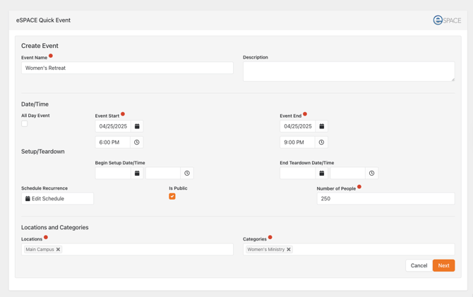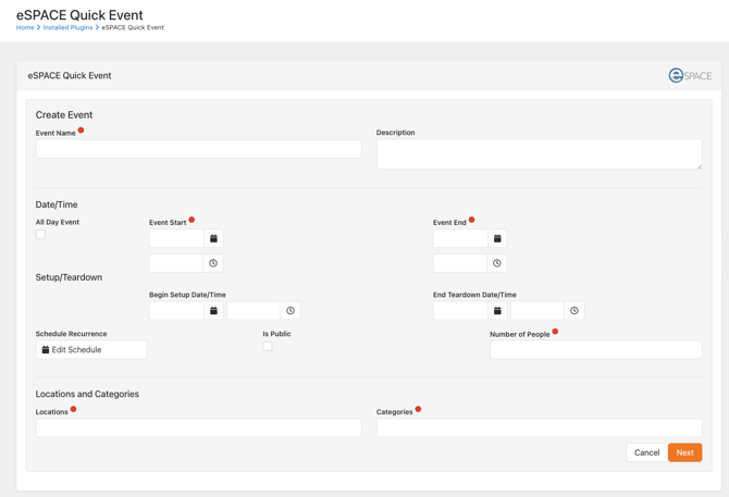 1. In Rock, once you click on eSPACE Quick Event Create, start by entering as many details as needed. Each field with a red circle is required, so those will be the minimum fields that will need to be filled out.