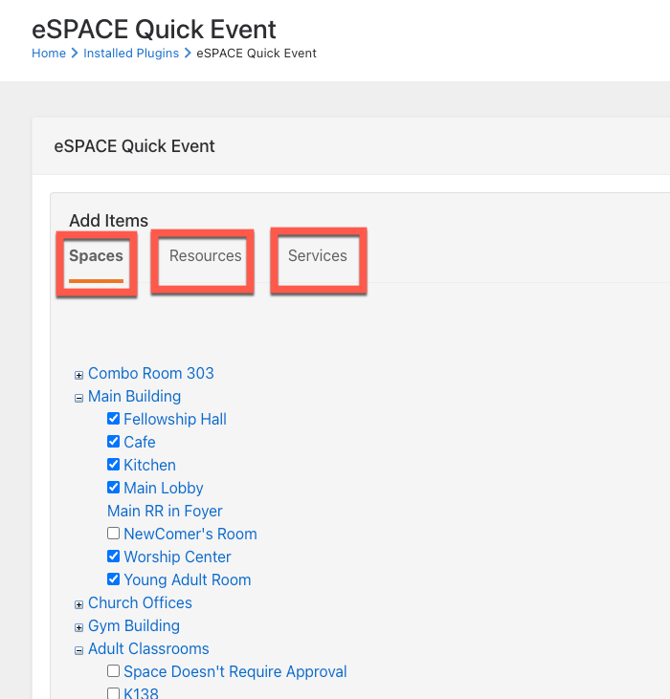 3. Next you will see all your spaces from your eSPACE account, as well as resources, and services so you can go ahead and choose those when building the event within Rock.