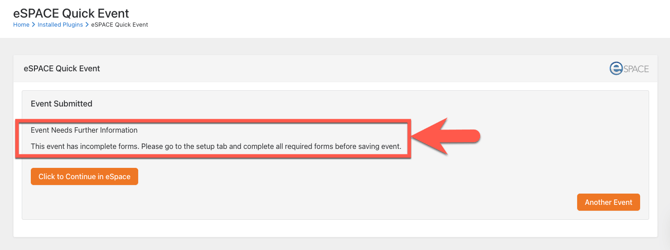 If you get the message that says "Event needs further information", you will need to click the button to navigate to the event in eSPACE and fill out the internal forms before you can submit the event for approval.