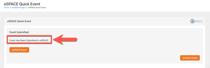 - You will see a message that says "Event has been submitted to eSPACE, which means no further action is needed on your part in eSPACE and you can either submit another event or move onto something else.