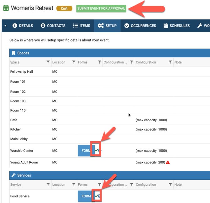 D. Once the forms are filled out, then you can submit the event for approval. All completed forms will show a green check mark next to them.