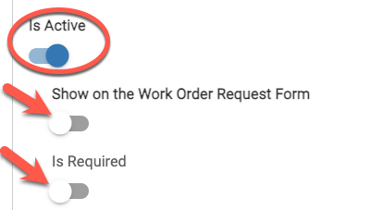 - Toggle on "Is Active" to see additional fields such as "Show on the Work Order Request Form" and "Is Required". Toggle on either or both of those sub-options if needed.