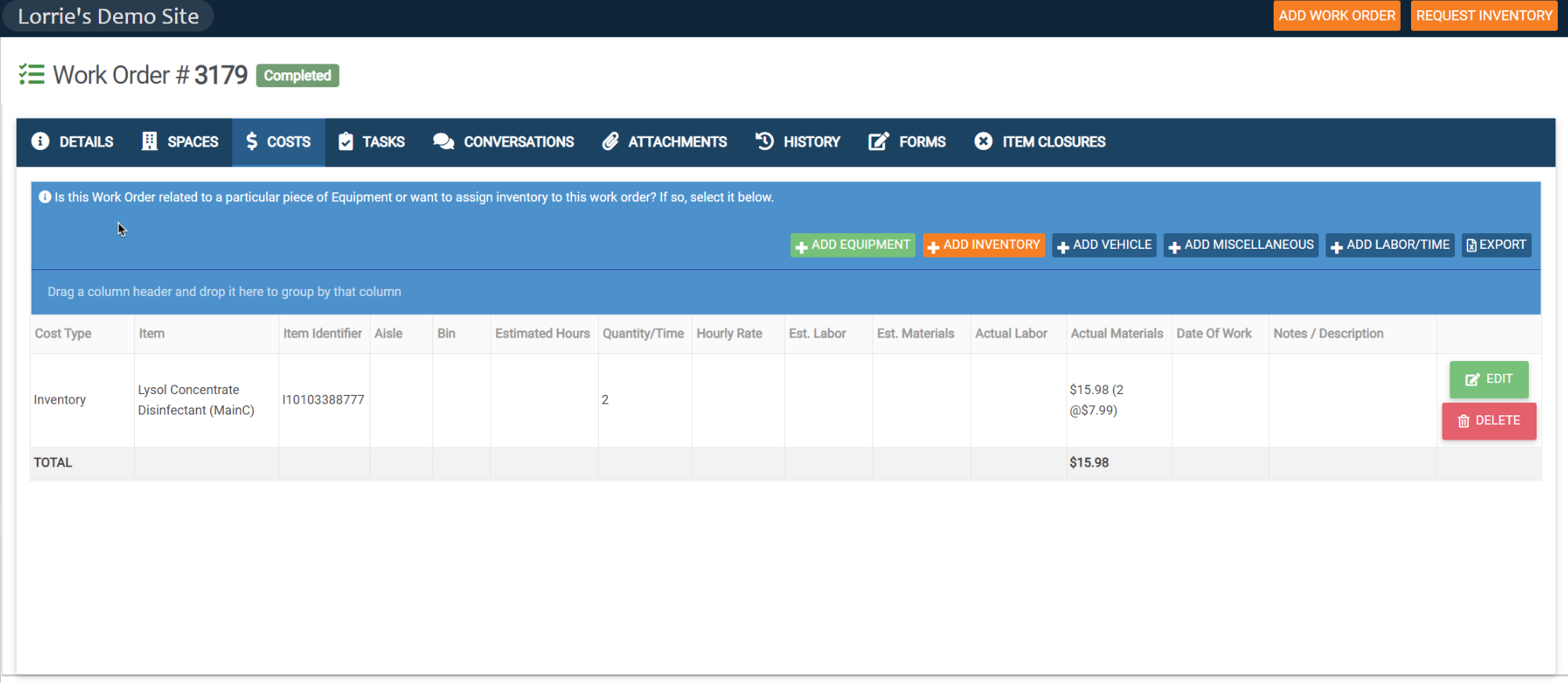 Once the inventory has been added, you will see the costs included within the work order.