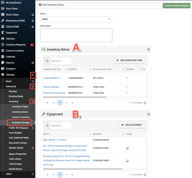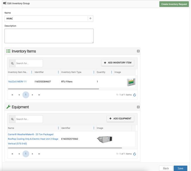 - EX: In the example above, an admin has grouped all the inventory items with the service category of HVAC in an Inventory Group called "HVAC". They have also grouped all the HVAC units by the service category of HVAC in the Inventory Group "HVAC".