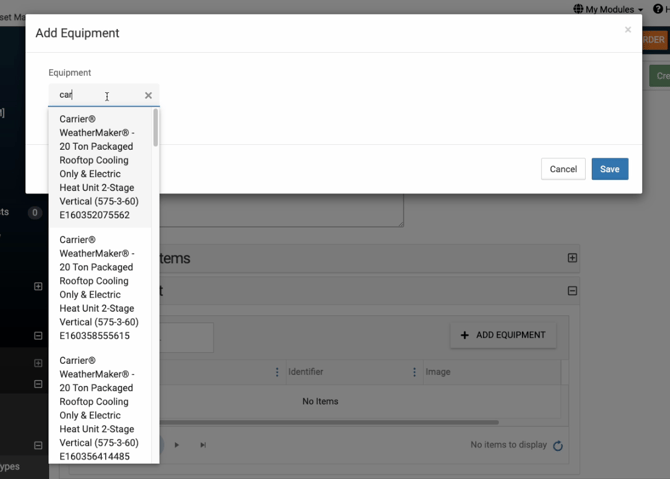 - B. For Equipment, a prompt will appear for you to simply begin typing the name of the Equipment.
