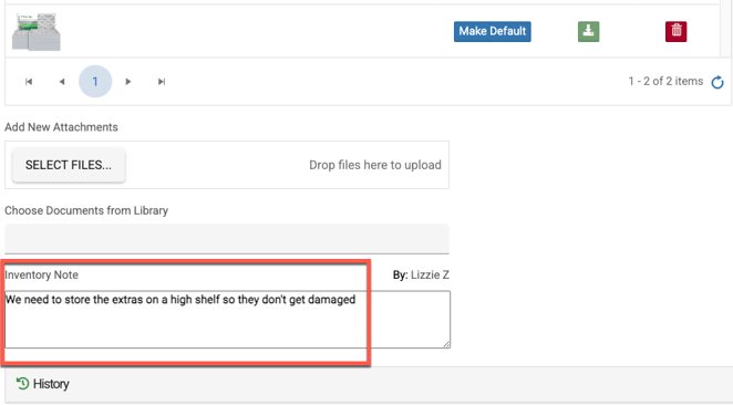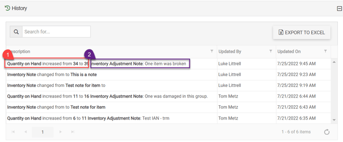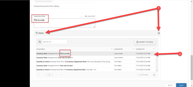 - When they return to Settings > Advanced> Inventory Items and click Edit to the right of that Item, you can click on History to reveal the (1) Inventory Adjustment and (2) Note you made: