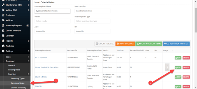 - Admins and sub-admins who can manage inventory can go to Settings>Advanced>Inventory Items and click Edit to the right of an item