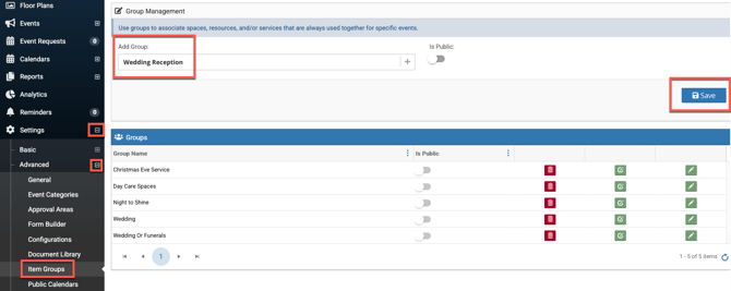 • If the Item Group is set to be public, then only spaces, resources and services that are also set as public will be available to add to the item group.