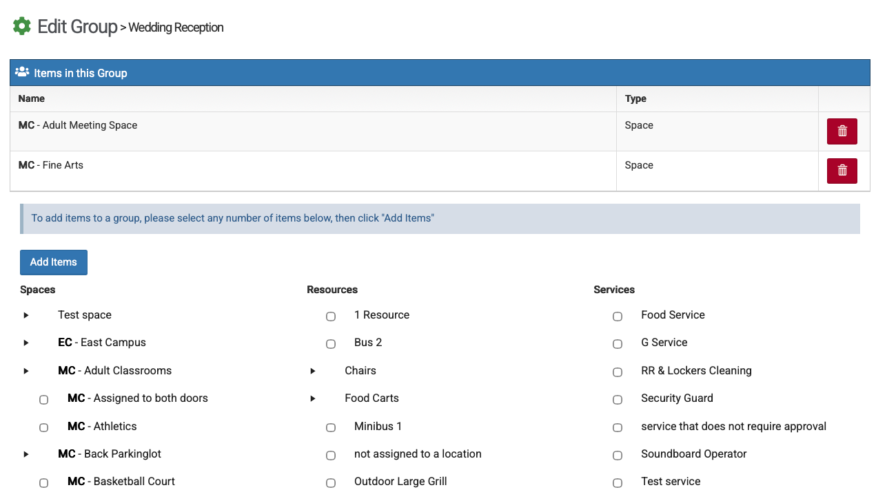 • 3. Once you name your Item group and save, the next page will allow you to choose what spaces, resources and services you want to add (depending again if your item group is public or not and what items are public or not).