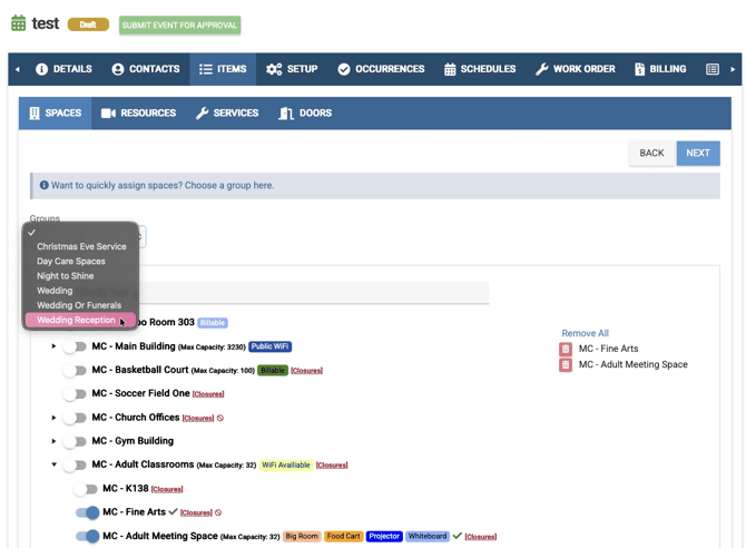 This feature allows Admins to add combinations of Spaces, Resources and Services under one group (i.e., default setting) to ease the set up of events that utilize the same components on a regular basis (i.e. weddings, classes, meetings, etc.).