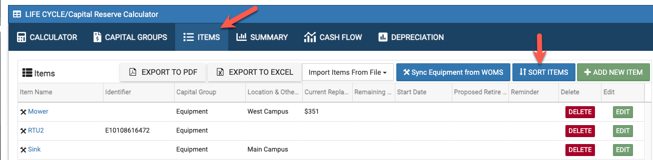 How to sort items in Life Cycle Calculator