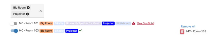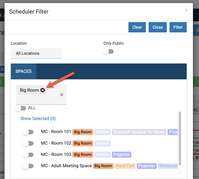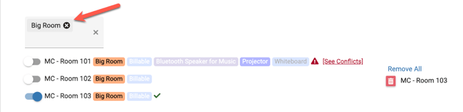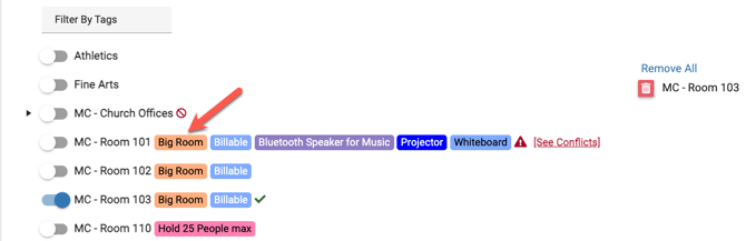 - So as an example above, lets say you want to get all "Big Rooms" that have a "Projector". You can simply choose these two tags in the filter area. Once filtered, the item list will filter down to just the items that match the filter!