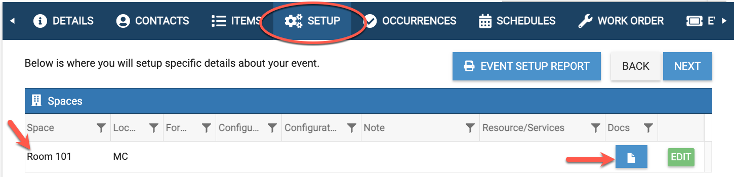 - When an item with a document attached is selected during the event creation process, the document icon w/link will show on the Setup tab, as well as the Summary tab so that it can be viewed.