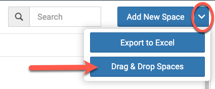 • To rearrange existing spaces into a hierarchy, use the Drag and Drop Spaces feature. Once you select Drag and Drop Spaces from the drop-down menu at the top right, click & hold a space then hover over the intended "parent" and release. Your changes will automatically be saved.
