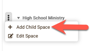 • For any existing space, click the three dots to the left of the space name and then choose "Add Child Space" in order to add a new space underneath that "parent space".