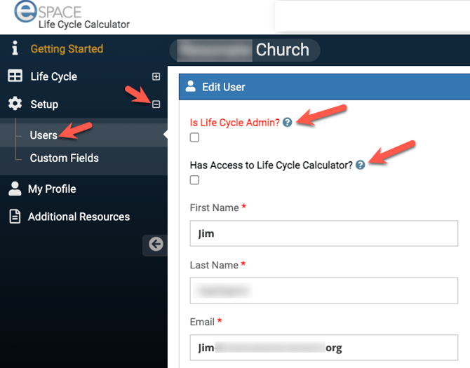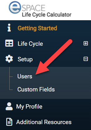 - Inside of Life Cycle Calculator, they can then choose to give admin or user access to each eSPACE user.